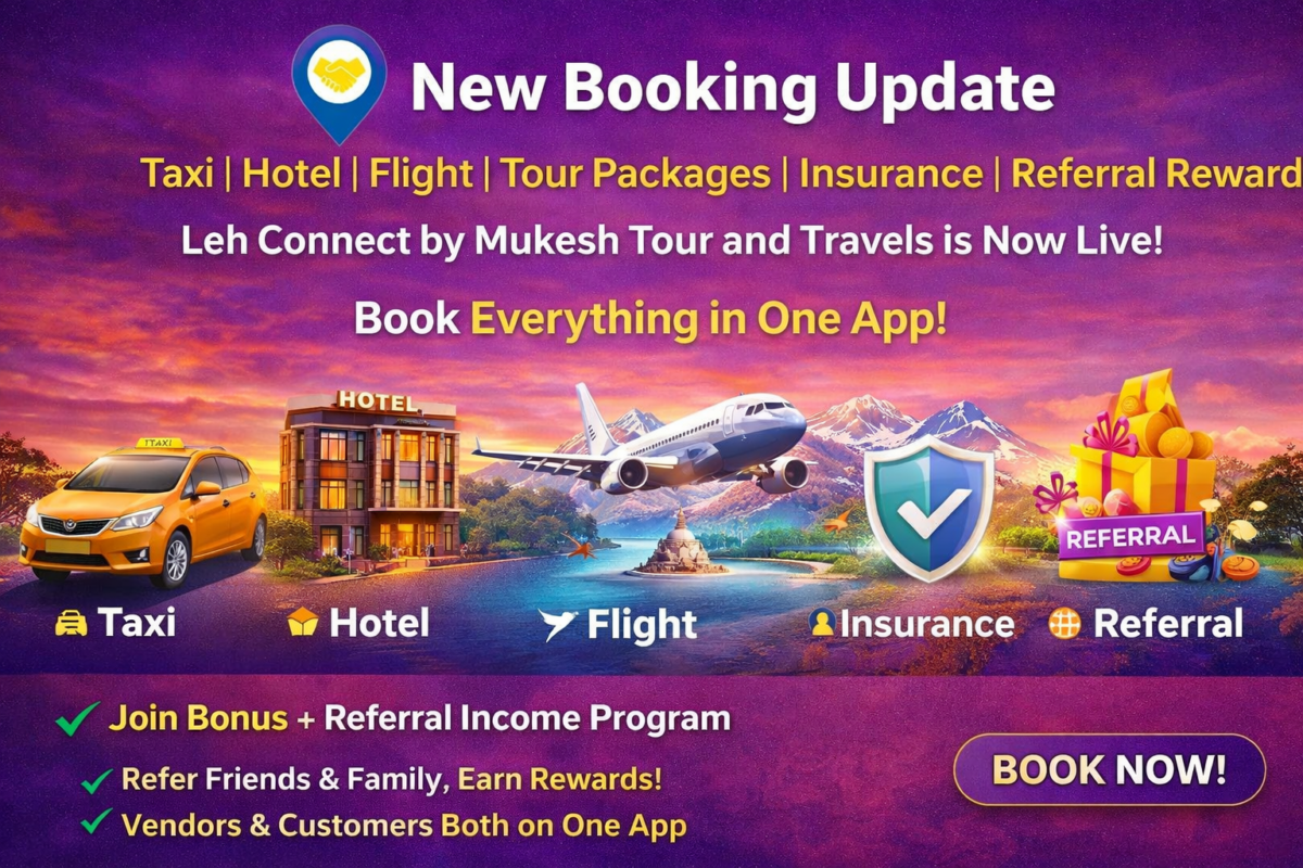 Leh Connect brings an exciting New Booking Update for customers of Mukesh Tour and Travels. Now you can book Taxi Service in Jaipur, hotel reservations, flight tickets, tour packages, and travel insurance all in one easy-to-use travel app. Leh Connect is a complete travel booking platform designed for both customers and vendors, offering safe and affordable taxi booking, comfortable hotel stays, and reliable flight services. With special features like join bonus and referral rewards, Leh Connect makes travel simple, rewarding, and convenient. Book everything in one app and enjoy a smooth travel experience with Leh Connect.